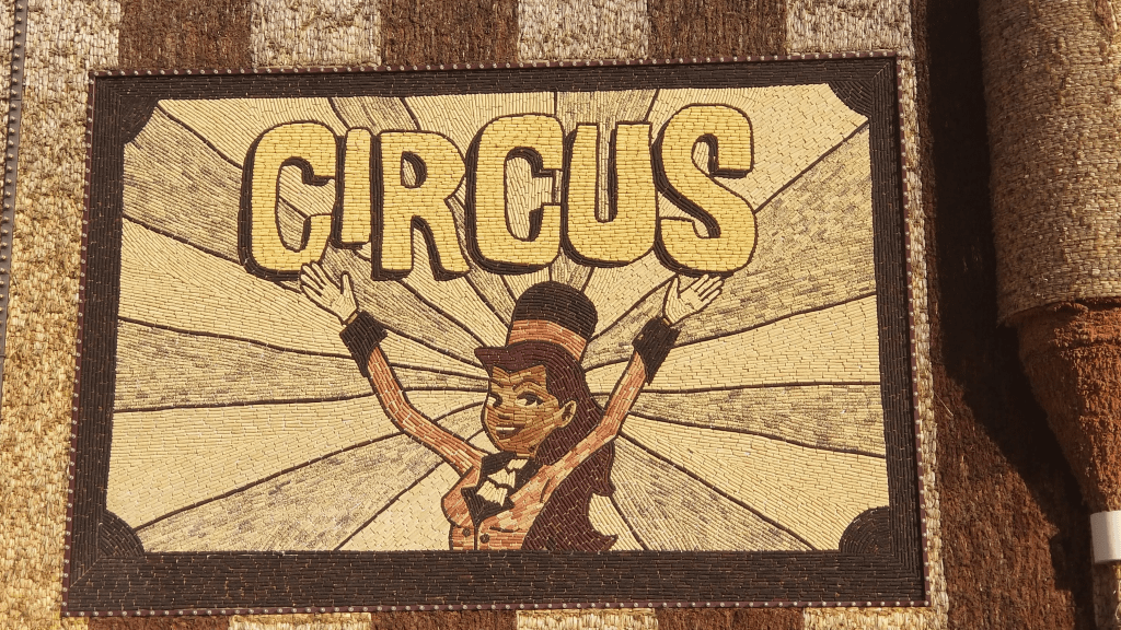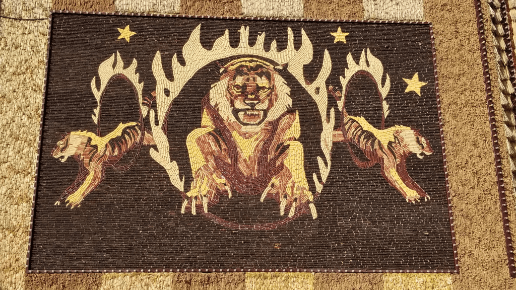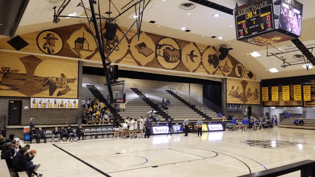 Having been rebuilt several times, the current version of the corn palace is a century old and has hosted premiere entertainers across the generations. Seating no more than several hundred, with a basketball court and a small stage, very little is palatial by current standards even compared to the field house of a small university. But the charm is unmistakable. The interior continues the corn motif, with the stage surrounded by small mosaics depicting community themes. During my visit, the local high school was hosting a team from a visiting town. Slash to the basket, miss, rebound and kick out, hit the three. The contest was well attended for a mid-afternoon tipoff, with flirting teens and beaming grandparents.