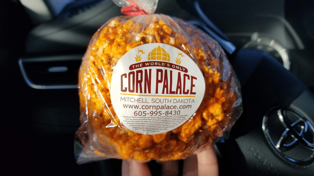 Unlike many roadside attractions, the corn palace was not covered in commercial advertisements or merchandise. Shirts and shot glasses are not available. A small concession stand was open, with the attendant recommending the cornball, a local delicacy. 1/3 of the ball as a serving is plenty.