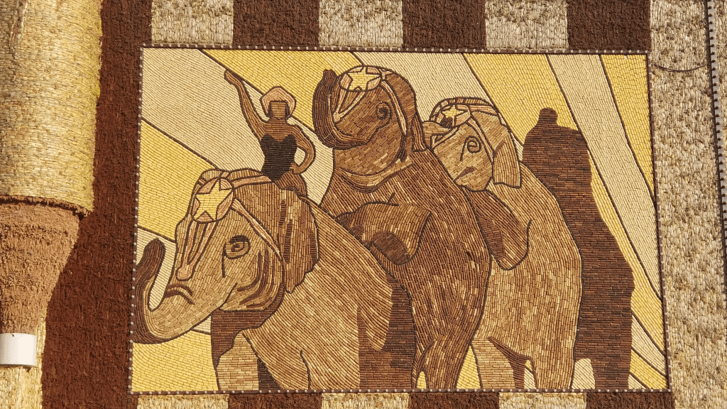 Mitchell, South Dakota is home to the only remaining corn palace in America. The building is both a folk art monument to the agricultural heritage of the Great Plains and a functioning civic center for the region. The exterior is covered in dried ears of corn, arranged into thematic designs, and refreshed annually in August. Currently, the walls depict circus scenes and are in great condition having not yet experienced a full winter.