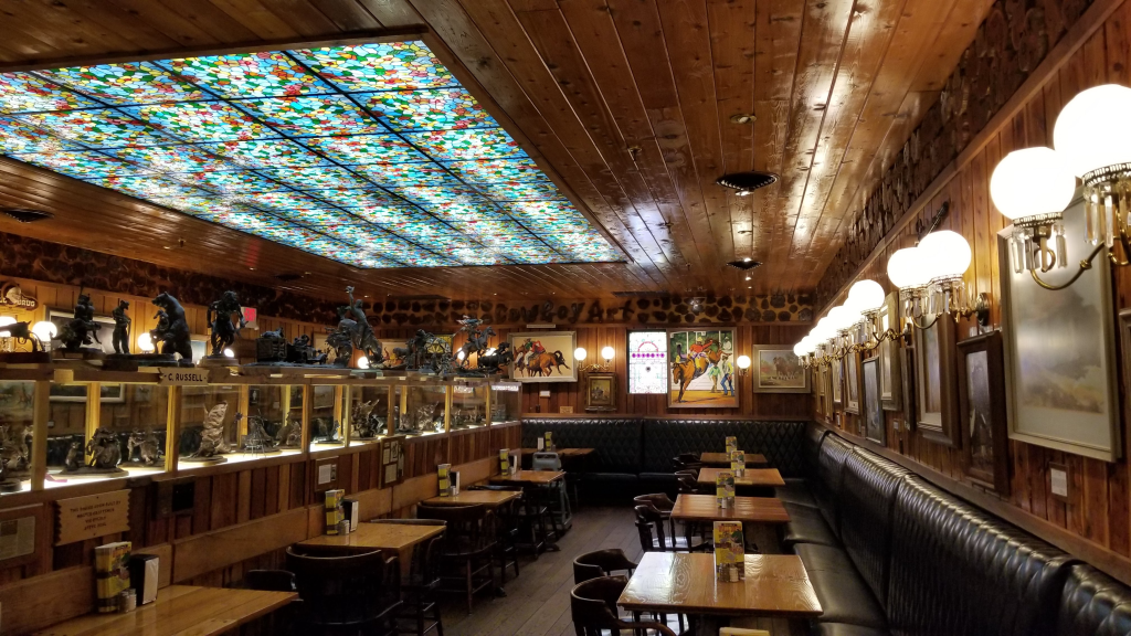 Wall Drug marketed “free water” for decades as a promotional giveaway to generate store traffic from weary travelers passing through or stopping in the nearby Badlands. Bumper stickers from Wall Drug can be seen across America on RVs and worldwide in expat bars and pubs. The current version of Wall Drug is a tourist trap with nearly every square foot dedicated to selling trinkets. However, the walls of the dining rooms are covered in Western-themed art depicting prairie life including cowboys, best described by: